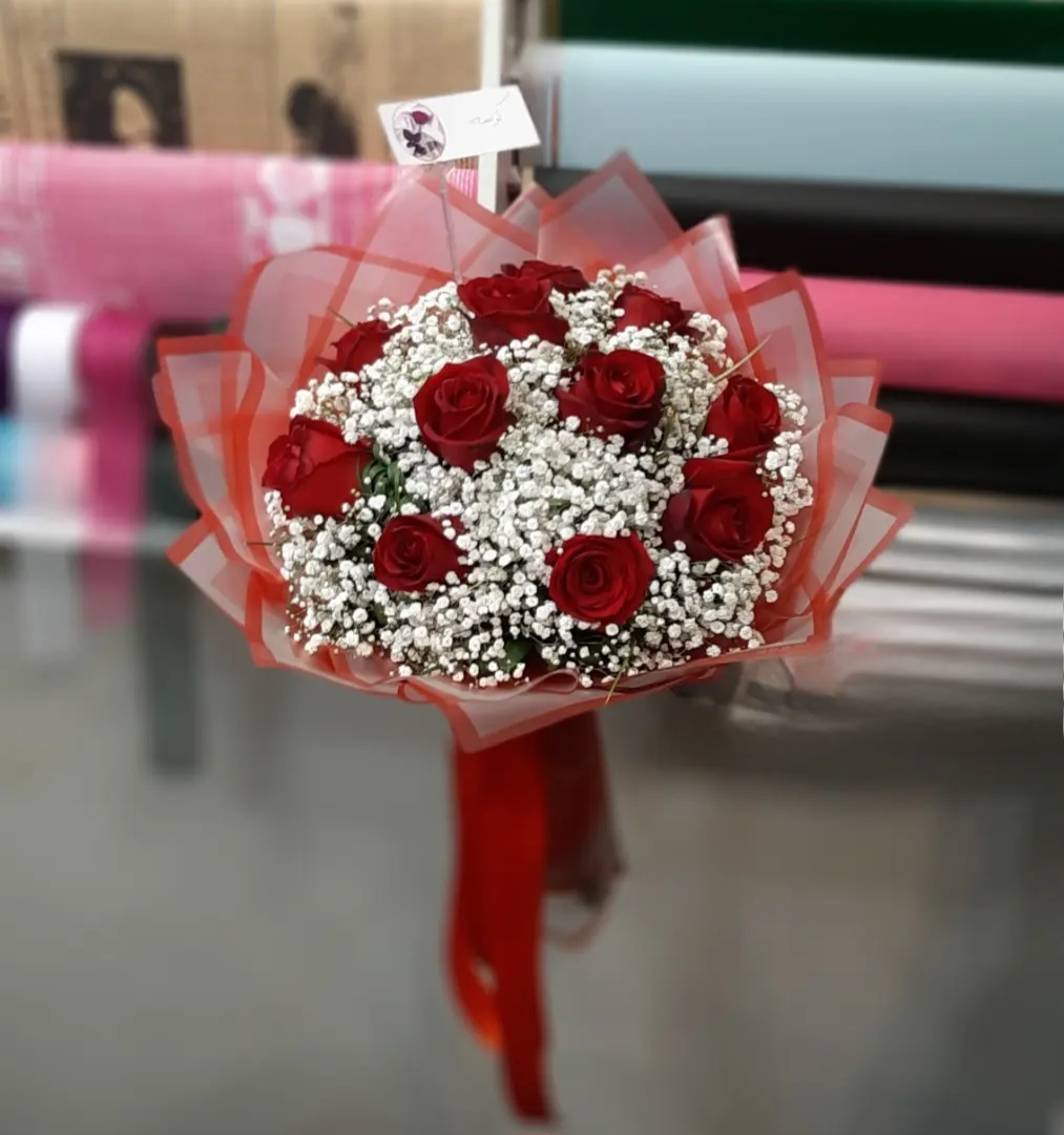 دسته گل رز هلندی به همراه ژیپسوفولیا و کاغذ ضد آب خارجی