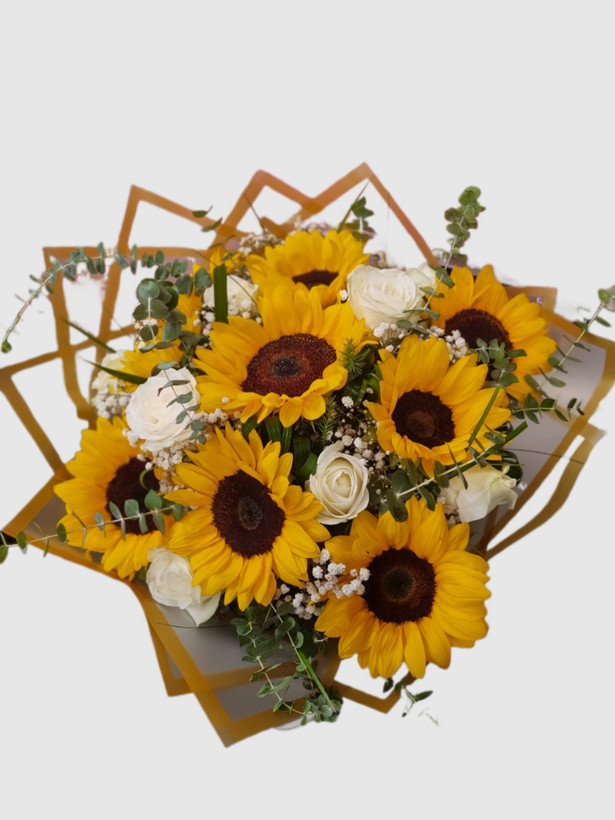 این دسته گل با ۹ شاخه گل آفتاب گردان و ۹ شاخه رزهلندی به همراه برگ اکالیپتوس و ژیپسوفیلیا و کاغذ ضد آب خارجی دیزاین شده است.