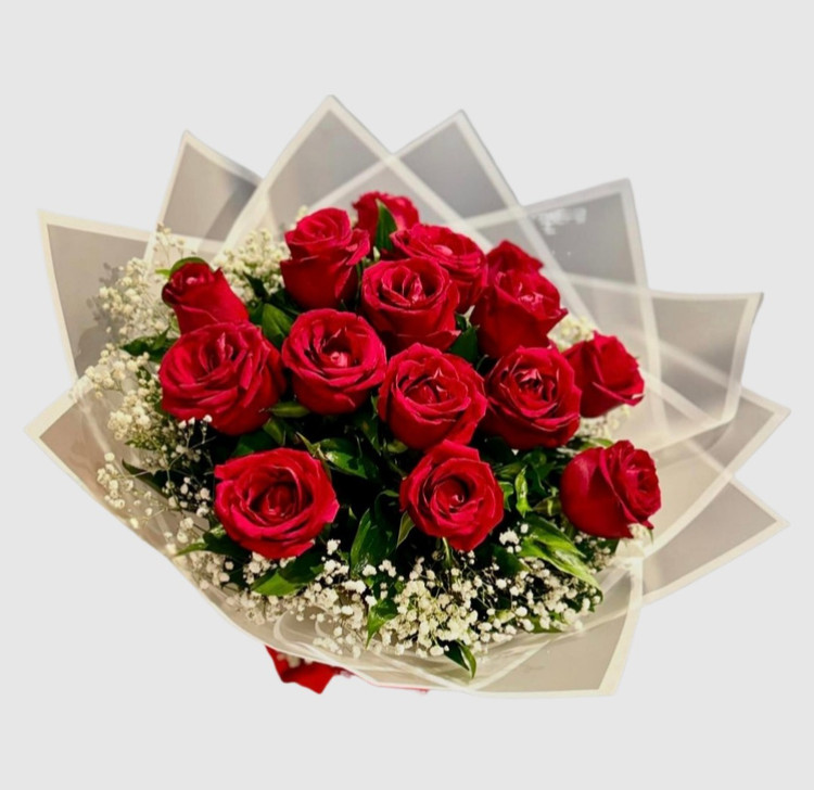 این دسته گل دارای ۱۵ شاخه رز هلندی قرمز و دو دسته ژیپسوفیلیا به همراه کاغذ ضد آب دیزاین شده است