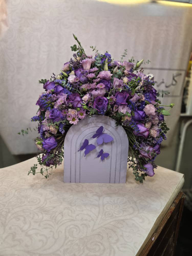 سبد گل سطلی آنتریوم بنفش و رز بنفش