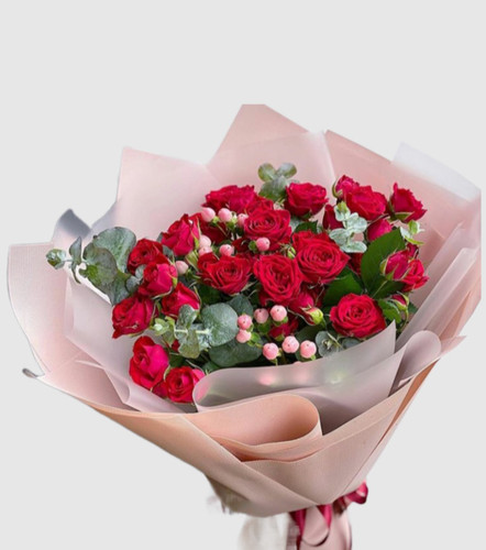 دسته گل رز مینیاتوری قرمز و اکالیپتوس